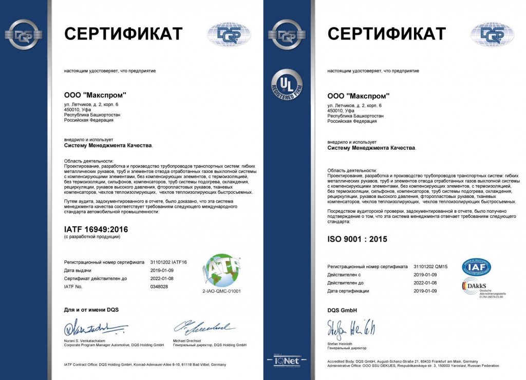 Компания «Макспром» завоёвывает большую долю рынка за счёт постоянно улучшающегося качества, при этом сохраняя достаточно низкую цену. Предприятие многие годы подряд выигрывает тендеры на поставку данной продукции, что говорит о её высоком качестве и соответствии требованиям не только российских, но и зарубежных компаний.В компании «Макспром» сертифицирована система менеджмента качества на соответствие требованиям международных стандартов IATF 16949:2016 и ISO 9001:2015. применительно к следующей продукции: гибкие металлорукава, компенсаторы, трубки рециркуляции отработавших газов, гибкие металлорукава отопления, модуль сильфона.