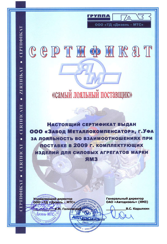 Сертификат ЯМЗ "Лояльный поставщик" 2009 г